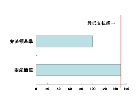財産が150万円ある場合は、100万円を上回りますので、財産基準の額である150万円が最低支払額となります。